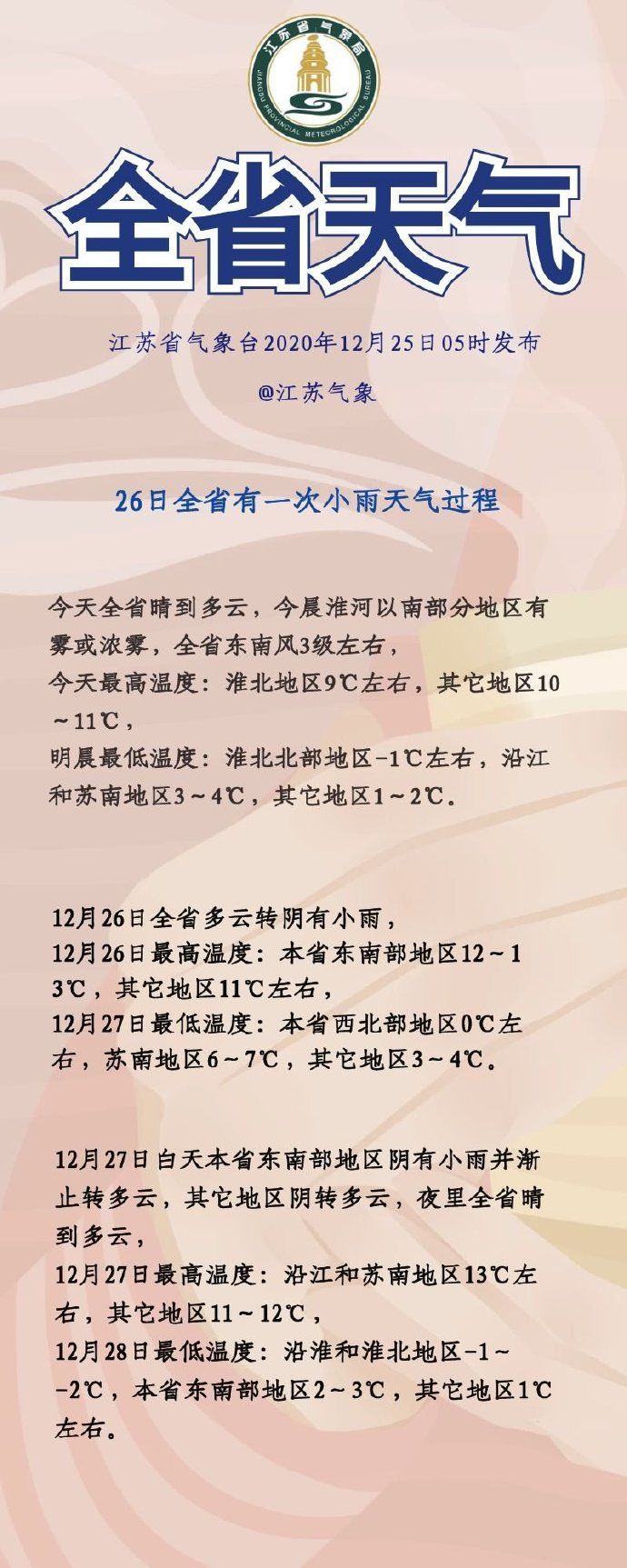 【天气晴好】今天全省晴到多云,今晨淮河以南部分地区有雾或浓雾,全省东南风3级左右,今天最高温度:淮北地区9℃左右,其它地区10~11℃,明晨最低温度:淮北北部地区-1℃左右,沿江和苏南地区3~4℃,其它地区1~2℃。