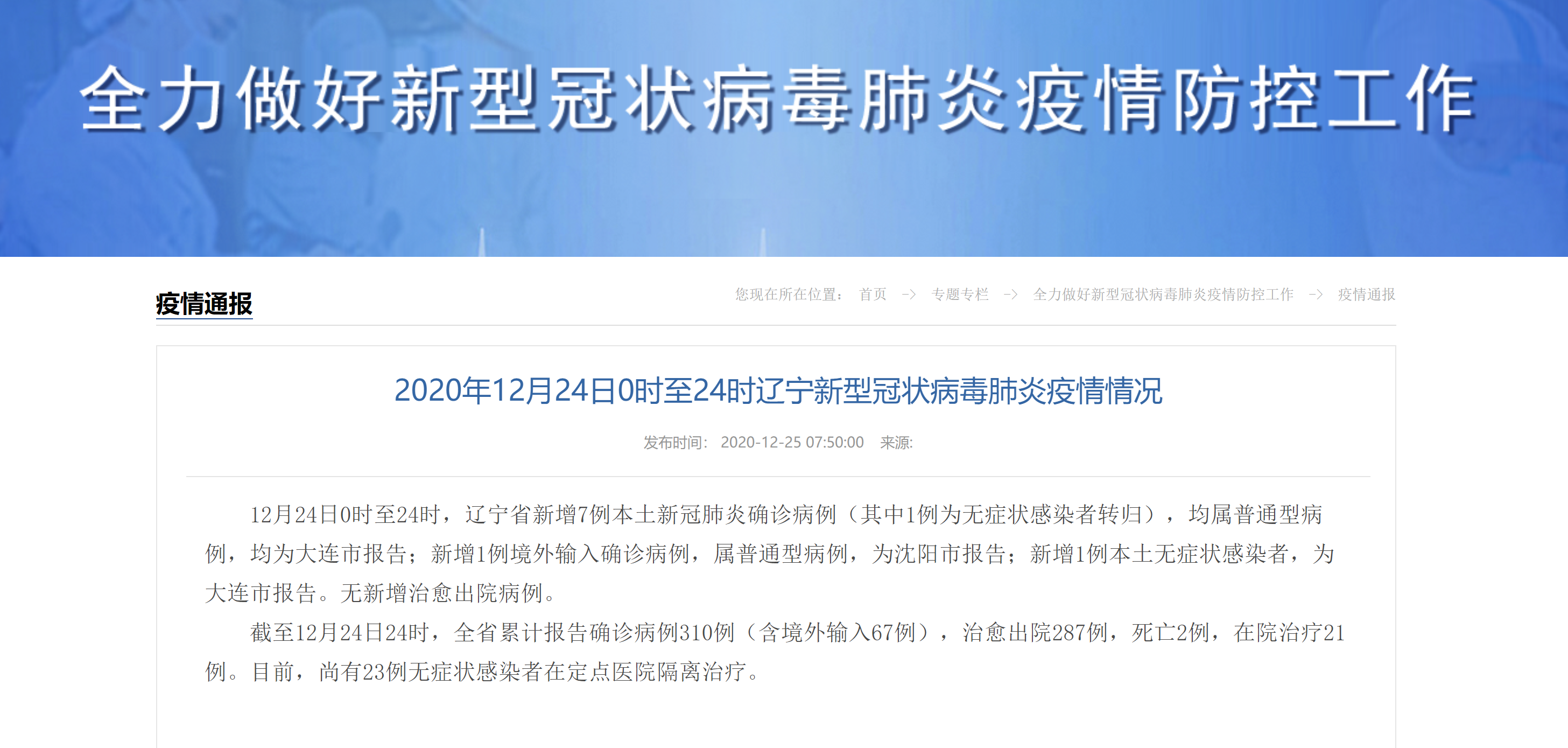 荔枝新闻讯 12月24日0时至24时,辽宁省新增7例本土新冠肺炎确诊病例(其中1例为无症状感染者转归),均属普通型病例,均为大连市报告;新增1例境外输入确诊病例,属普通型病例,为沈阳市报告;#辽宁新增1例本土无症状#感染者,为大连市报告。截至24日24时,辽宁省累计报告确诊病例310例(含境外输入67例),治愈出院287例,死亡2例,在院治疗21例。目前,尚有23例无症状感染者在定点医院隔离治疗。