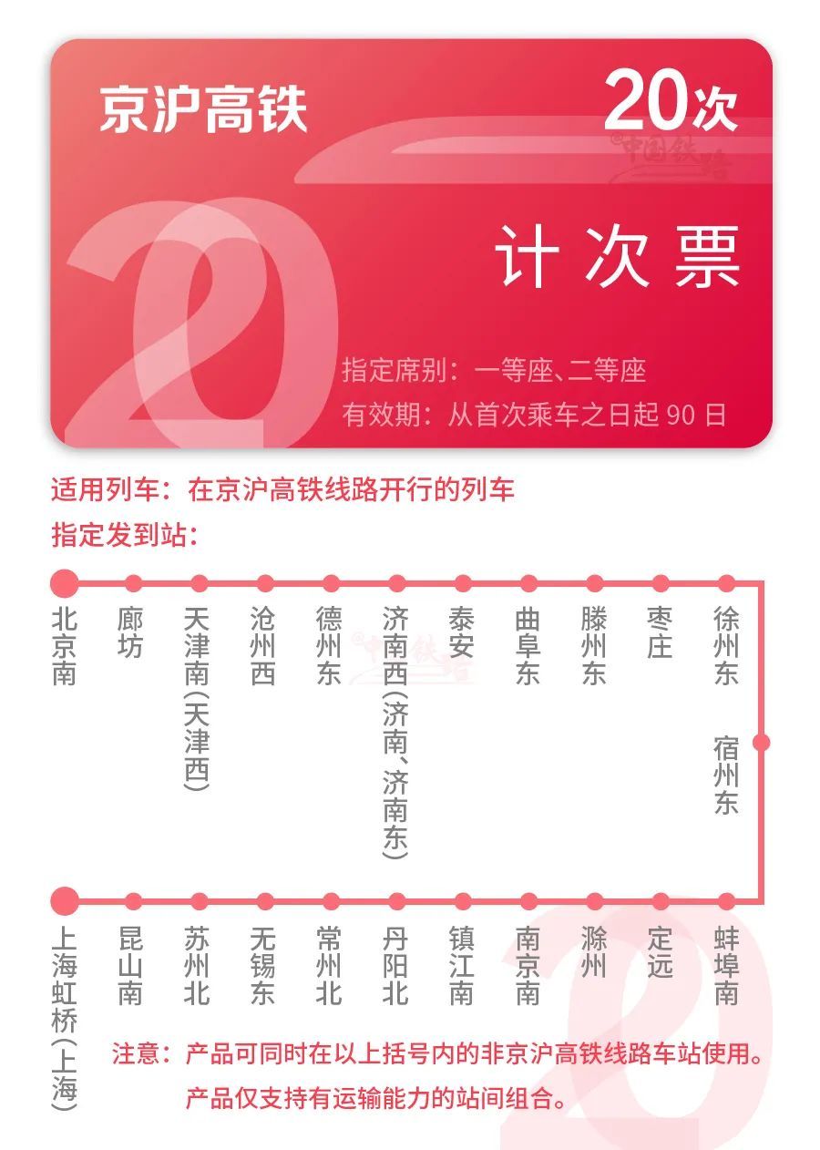 不过,小明还可以同时启用北京南到天津南、济南西到徐州东等不同发到站的计次票哦!