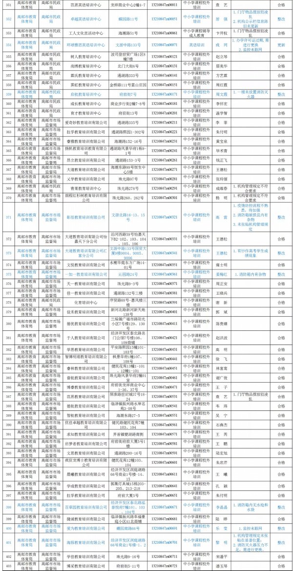 今年,根据省教育厅部署,因新冠疫情等原因2019-2020年学年度的校外培训机构年检延迟至年底,各县级教育主管部门经过材料审核、视频检查和现场抽查,并结合机构办学质态,现将全市校外培训机构年检结果予以公示。