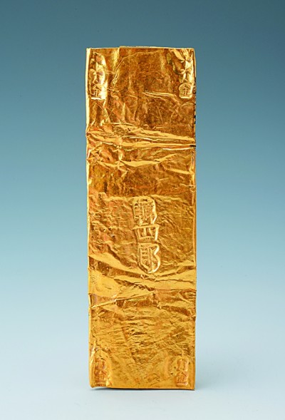 广东南海一号南宋沉船出土的“韩四郎”金叶子。光明日报记者李韵摄