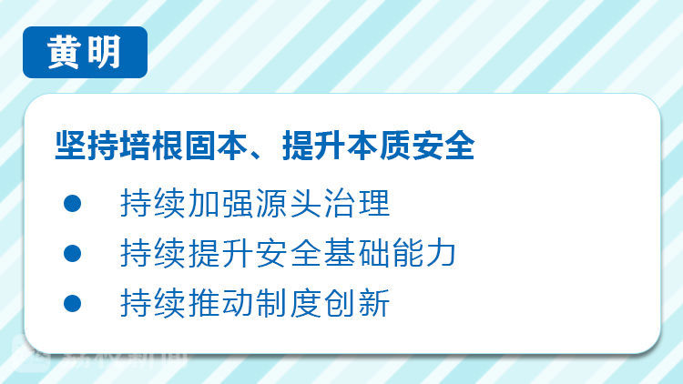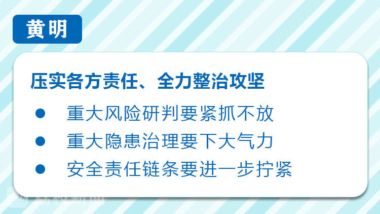 黄明要求,深化专项整治,要压实各方责任、全力整治攻坚。一是重大风险研判要紧抓不放。对专项整治中还未整改到位的问题隐患,要逐一梳理、滚动研判,紧盯不放、彻底治理,同时高度警惕新业态、新技术、新局势带来的苗头性问题,“主动上前一步”纳入监管;要加强改革政策的安全评估,同步配套事中事后监管措施,及时加强指导服务,防止漏管失控引发事故。二是重大隐患治理要下大气力。紧紧盯住大型油气储备库、剧毒爆炸危化品、大型商业综合体和重点矿山,有针对性逐一落实安全防范责任、措施、预案;省整治专班和省市县三级督导组要继续对化工、交通运输、涉爆粉尘和危化企业搬迁等治理难度大的突出问题进行跟踪督导,确保整治到位。三是安全责任链条要进一步拧紧。已经制定的党委政府、各有关部门和各级领导干部的安全责任清单,要加强日常监督检查,确保落细落实,防止松劲懈怠;已经建立的协同工作机制要在实践中加强磨合,尤其是油气管道保护、污染防治、危废处置、农机安全、燃气安全和有限空间应急处置等方面安全风险防控机制还要不断健全完善,切实做到密切协作、形成合力。