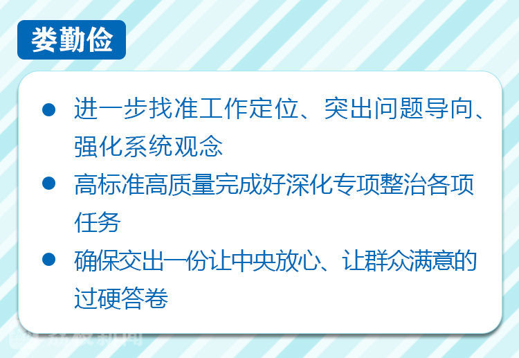 娄勤俭代表省委、省政府向国务院督导组表示衷心感谢。他说,督导组进驻江苏以来,以强烈的政治担当、极端负责的精神和务实严谨的作风,全程督导江苏专项整治工作,付出了极大的心血和汗水,为江苏在较短时间内扭转被动局面、打好安全生产翻身仗,提供了精准指导和有力支持。他表示,下一步,江苏将坚持不懈用习近平新时代中国特色社会主义思想解放思想、统一思想,深入贯彻总书记关于统筹发展和安全、关于安全生产工作的重要论述,对标对表总书记赋予江苏“争当表率、争做示范、走在前列”的重大使命,进一步找准工作定位、突出问题导向、强化系统观念,高标准高质量完成好深化专项整治各项任务,确保交出一份让中央放心、让群众满意的过硬答卷。