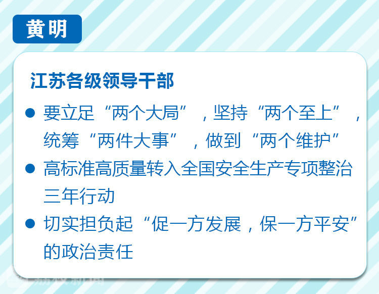 黄明指出,根据习近平总书记重要指示精神,按照国务院部署安排,国务院督导组去年11月进驻江苏,指导帮助江苏集中开展了一年的安全生产专项整治。一年来,江苏各级党委政府认真贯彻落实习近平总书记重要指示精神,以做到“两个维护”的政治自觉,以前所未有的力度、超乎常规的措施、攻坚克难的劲头,开展全方位、系统性集中整治,全省上下思想观念发生很大转变、安全责任链条逐步压紧压实、安全基础进一步夯实、安全发展水平明显提高,有效防范化解了一批重大安全风险,事故多发重发的被动局面得到改变。虽然专项整治取得显著成效,但要清醒看到,江苏现阶段安全生产风险隐患仍然突出,总体仍处于事故易发多发期,特别是事故总量仍处高位、存量风险仍然较多、增量风险日益凸显,影响安全生产的不稳定、不确定因素也明显增多,巩固安全形势、防止事故反弹任务仍艰巨繁重。江苏各级领导干部要进一步提高政治站位,立足“两个大局”,坚持“两个至上”,统筹“两件大事”,做到“两个维护”,强化底线思维和忧患意识,以高度的政治自觉思想自觉行动自觉,高标准高质量转入全国安全生产专项整治三年行动,持之以恒推动整治措施落实落地,切实担负起“促一方发展,保一方平安”的政治责任,真正在全国当表率、做示范、走前列。