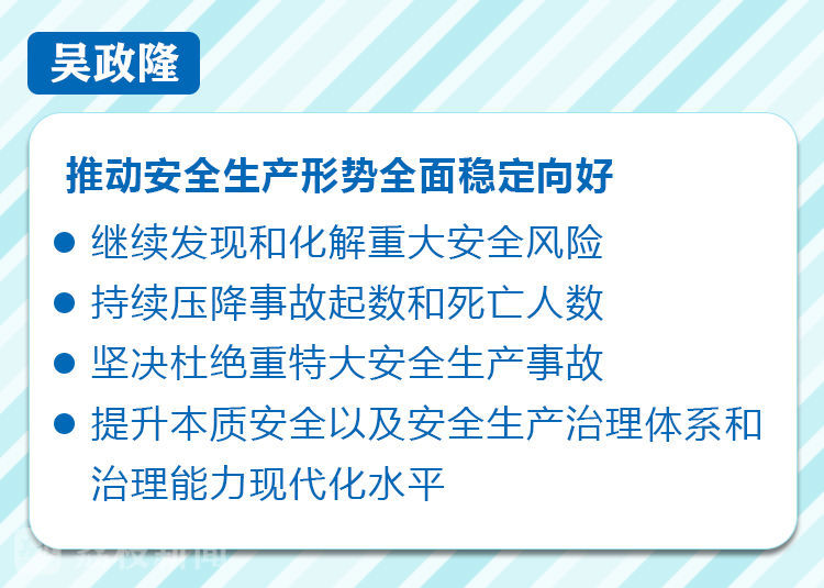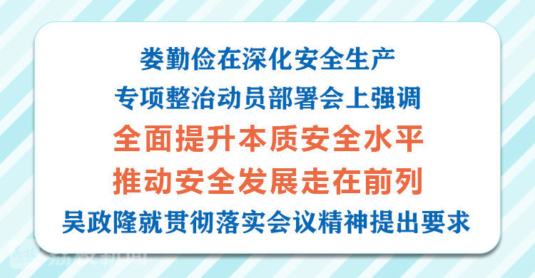 吴政隆指出,要深入贯彻习近平总书记关于安全生产重要论述和对江苏工作重要指示精神,认真落实党中央、国务院决策部署,切实担负起“争当表率、争做示范、走在前列”的重大使命,树牢新发展理念,坚持安全发展,坚持人民至上、生命至上,政治站位再提高、思想认识再深化、工作举措再强化、工作责任再压实、工作成效再提升,举一反三抓好国务院督导组指出问题整改落实,巩固拓展“一年小灶”成果,聚焦煤矿与非煤矿山、化工与危化品、冶金工贸、交通运输、建筑施工、商业综合体、城乡住房与燃气、城市安全、消防等重点领域,强化针对性措施,以最严举措最硬作风高标准高质量完成“三年大灶”专项整治目标任务,确保整治成效体现到继续发现和化解重大安全风险上来,体现到持续压降事故起数和死亡人数上来,体现到坚决杜绝重特大安全生产事故上来,体现到提升本质安全以及安全生产治理体系和治理能力现代化水平上来,推动安全生产形势全面稳定向好,以实际行动实际成效践行“两个维护”。