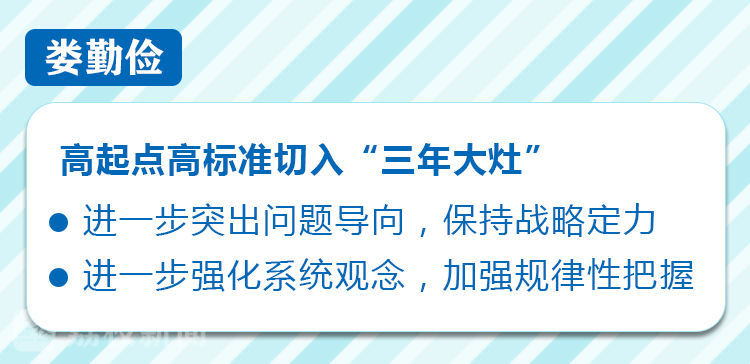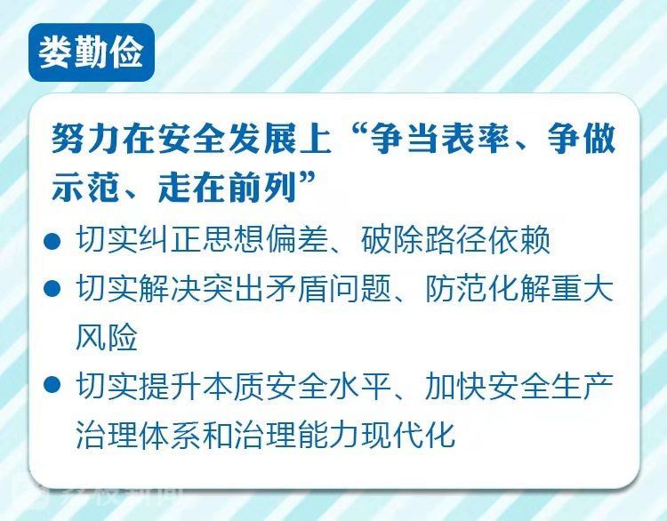 娄勤俭指出,要在全面巩固“一年小灶”成果、推广典型经验做法的基础上,高起点高标准切入“三年大灶”,推动全省安全生产工作不断迈上新台阶。要进一步突出问题导向,保持战略定力,加大工作力度,切实解决好专项整治工作不够平衡、长期积累的风险仍然较多、本质安全水平与高质量发展要求还有很大差距等突出问题。要进一步强化系统观念,加强规律性把握,努力做到责任具体化、监管科学化、技防现代化,推动安全生产治理体系和治理能力现代化,交出一份让中央放心、让群众满意的过硬答卷,推动“强富美高”新江苏建设不断取得新成效。