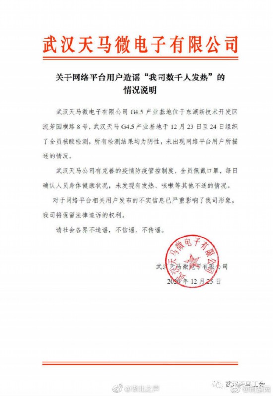荆楚网12月25日消息,网传“武汉一公司数千人发热”,该公司回应称,公司于12月23日至24日组织了全员核酸检测,所有检测结果均为阴性,未出现网络平台用户所描述的情况。请社会各界不造谣,不信谣,不传谣。