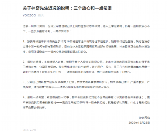 当天,游族网络再度发布声明称,游族网络董事长林奇于12月16日晚返家途中出现急性不适症状,随即自行赶赴医院,院方在治疗过程中第一时间与警方取得联系,目前治疗方案和原因调查双线都有明确进展,林奇目前正在住院恢复治疗,各项体征稳定。