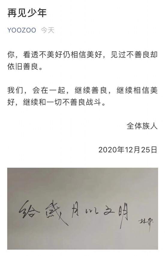 游族网络公众号发布一则“再见少年”的消息,署名为“全体族人”。