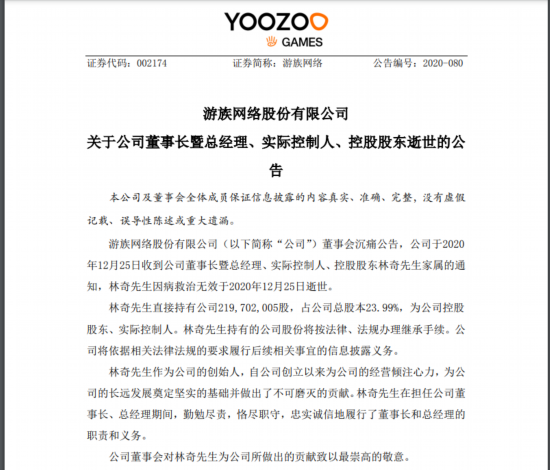 当天,游族网络发布公告称,收到公司董事长暨总经理、实际控制人、控股股东林奇家属的通知,林奇因病救治无效于12月25日逝世。