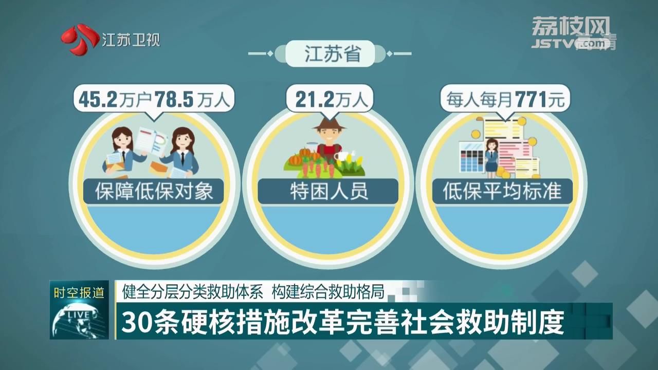 据了解,近年来我省社会救助措施密集出台,救助水平稳步提升:目前,江苏全省共保障低保对象45.2万户78.5万人,特困人员21.2万人,低保平均标准达到每人每月771元。为进一步编密织牢保障困难群众基本生活的安全网,《实施意见》结合江苏实际,在完善救助制度体系、夯实基本生活救助、健全专项社会救助等八个方面进行细化和拓展。
