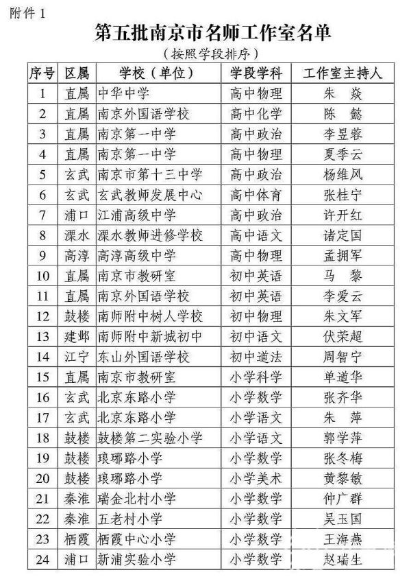 本次公布的第五批南京市名师工作室共有24个,除了语数外等科目外,高中体育、初中道德与法治、小学科学、小学美术各有一个市名师工作室。