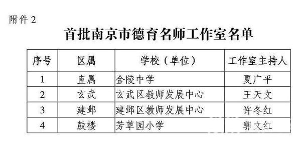 今年南京市还推出了首批德育名师工作室,包括金陵中学、玄武区教师发展中心、建邺区教师发展中心和芳草园小学,涉及班主任团队建设、班集体建设、德育管理、心理健康教育等方向。