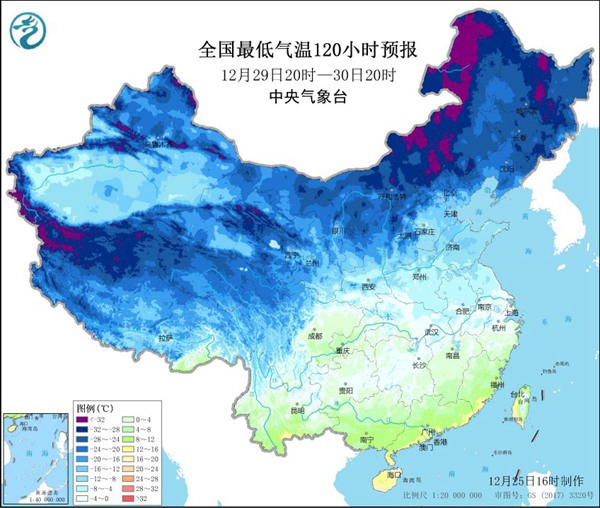 中央气象台首席孙军分析称,这次寒潮过程偏强,一些地方可能会出现气温破历史同期最低的情况。像北京,目前预计29日至30日平原地区夜间最低气温-13℃左右,接近近十年历史同期的最低值。