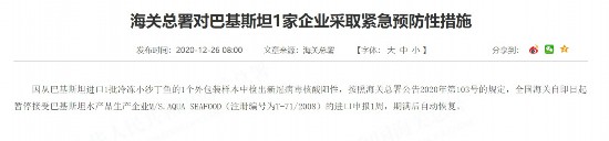 据海关总署26日消息,因从巴基斯坦进口1批冷冻小沙丁鱼的1个外包装样本中检出新冠病毒核酸阳性,按照海关总署公告2020年第103号的规定,全国海关自即日起暂停接受巴基斯坦水产品生产企业M/S.AQUA SEAFOOD(注册编号为T-71/2008)的进口申报1周,期满后自动恢复。