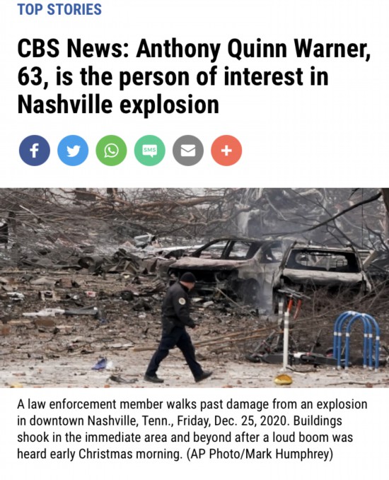 据美国媒体CBS新闻当地时间12月26日报道称,多个消息来源证实,纳什维尔的一名63岁白人男性居民,安东尼·奎因·华纳(Anthony Quinn Warner)为纳什维尔汽车爆炸案的嫌疑人之一。华纳拥有和涉事爆炸房车高度相似的车辆,目前联邦调查局正在搜索其住所。