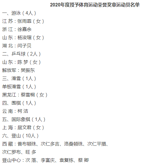 近日,体育总局发布《关于授予2020年度体育运动奖章的决定》,授予张雨霏等19名运动员、崔登荣等12名教练员2020年度体育运动荣誉奖章,授予王简嘉禾等9名运动员、韩冰岩等5名教练员2020年度体育运动一级奖章。