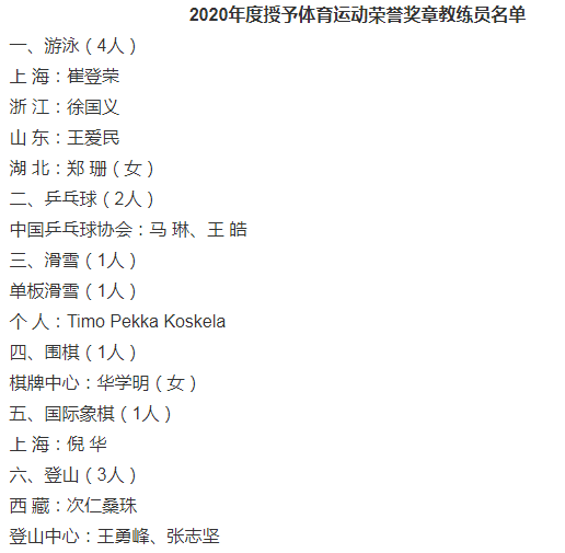 获得体育运动荣誉奖章的教练员里,今年7月不幸去世的徐嘉余、叶诗文的恩师徐国义在列,另外还有张雨菲的主管教练崔登荣。乒乓球教练有马琳和王皓,分别是陈梦和樊振东的主管教练。棋牌中心获奖的教练,是中国围棋队领队华学明,国际象棋获奖的教练是倪华。