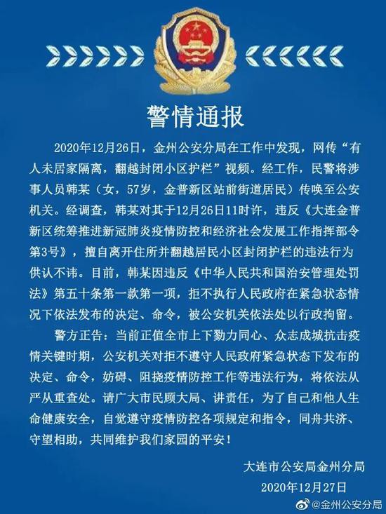 荔枝新闻讯 @金州公安分局发布警情通报称,26日,网传“有人未居家隔离,翻越封闭小区护栏”视频。经调查,涉事人员韩某(女,57岁)于26日11时许,擅自离开住所并翻越居民小区封闭护栏的违法行为供认不讳。目前,公安机关依法对其处以行政拘留。