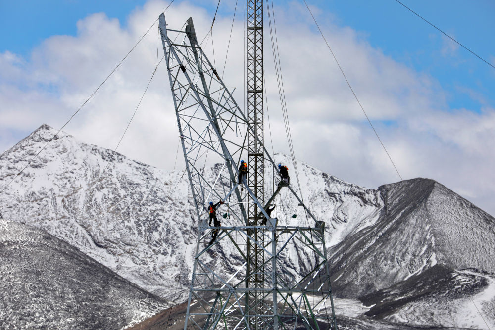 在西藏日喀则市定日县,施工人员在西藏阿里与藏中电网联网工程线路4标段作业(2020年4月28日摄)。 新华社发
