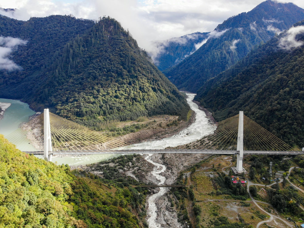 川藏公路通麦路段上的迫龙沟特大桥(2019年10月27日摄,无人机照片)。新华社记者 孙非 摄