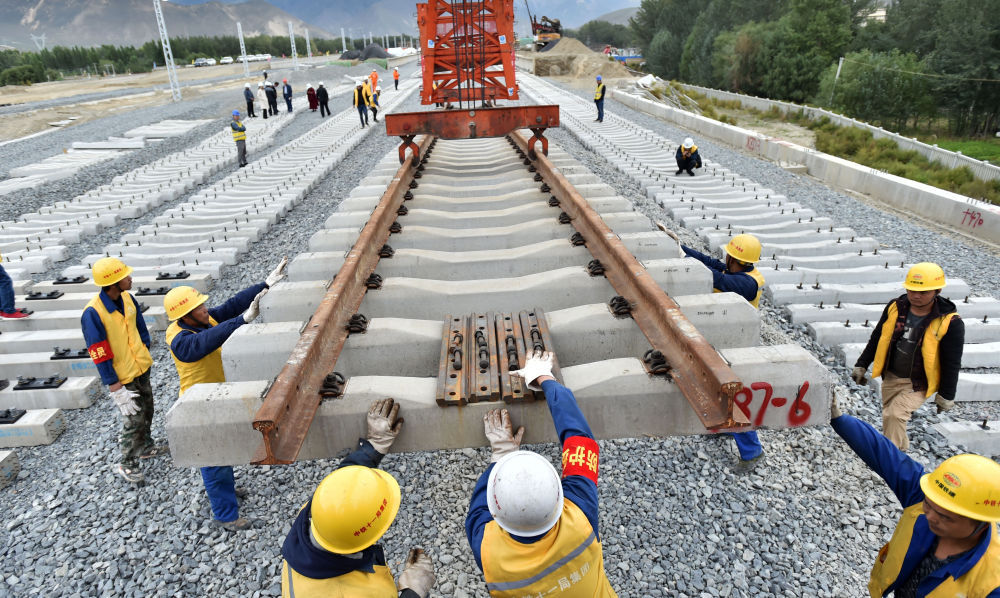 在川藏铁路拉萨至林芝段,工人进行铺轨作业(2019年9月2日摄)。新华社记者 觉果 摄