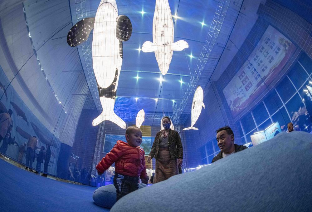在西藏自治区自然科学博物馆,观众参观《鲸奇世界》巡展(2020年10月30日摄)。新华社记者 晋美多吉 摄