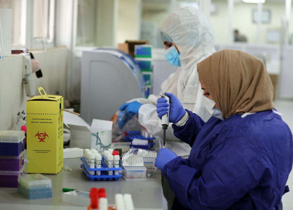 11月8日,在伊拉克巴格达,工作人员在中国援建伊拉克抗击新冠疫情的核酸检测实验室里检测样本。新华社发
