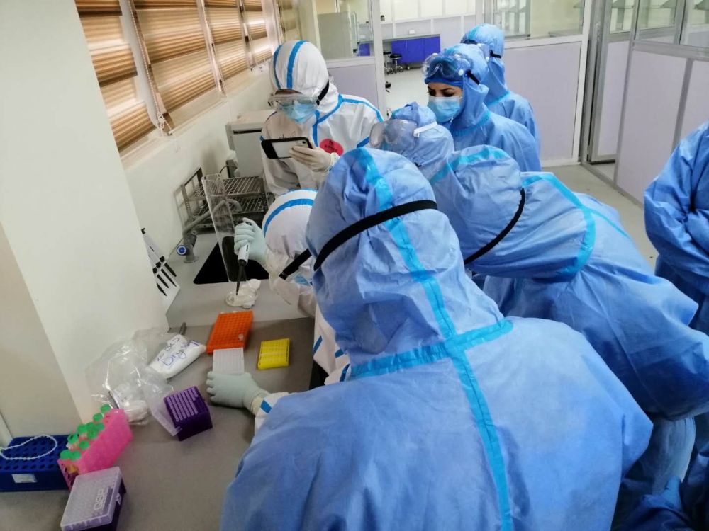 3月26日,张淼(持手机者)在中国援建伊拉克抗击新冠疫情的核酸检测实验室内拍摄质控测试和检测培训。(记者本人供图)