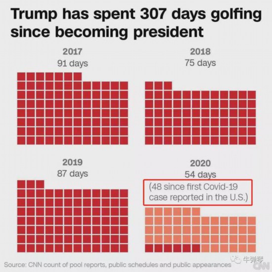随后,CNN还做了一个小统计,当上总统4年间,特朗普花了307天在打高尔夫,
