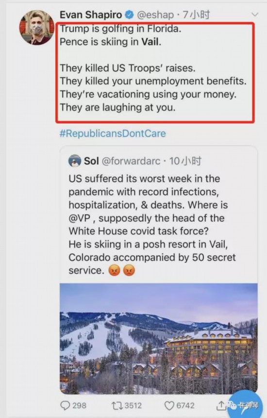 美国正在遭受疫情以来最糟糕的一周,创纪录的确诊、入院、死亡。副总统在哪里?他被认为是白宫抗疫总指挥,他却在50名特勤士兵保护下,在科罗拉多州范尔度假村滑雪……