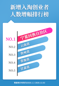 截至12月2日,今年入淘创业者同比增幅排名中,西部省(自治区、直辖市)在前10名中占据9席,且增速全部超过200%。其中,宁夏、云南、贵州、青海和甘肃位列前五。服饰、生鲜和百货是西部淘宝商家最喜欢的三个创业领域。