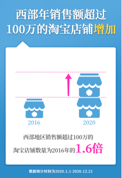 除了数量增加,西部地区在电商领域也迎来高质量发展。淘宝方面介绍,2016年至今,西部地区皇冠及以上的淘宝店铺数量增长了109%;年销售额超过100万的商家数量也达到了5年前的1.6倍。
