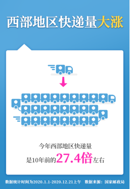 与此同时,西部地区的快递数量出现几何级数增长。国家邮政局数据显示,截至12月21日上午,今年西部地区快递量已达到10年前的27.4倍。