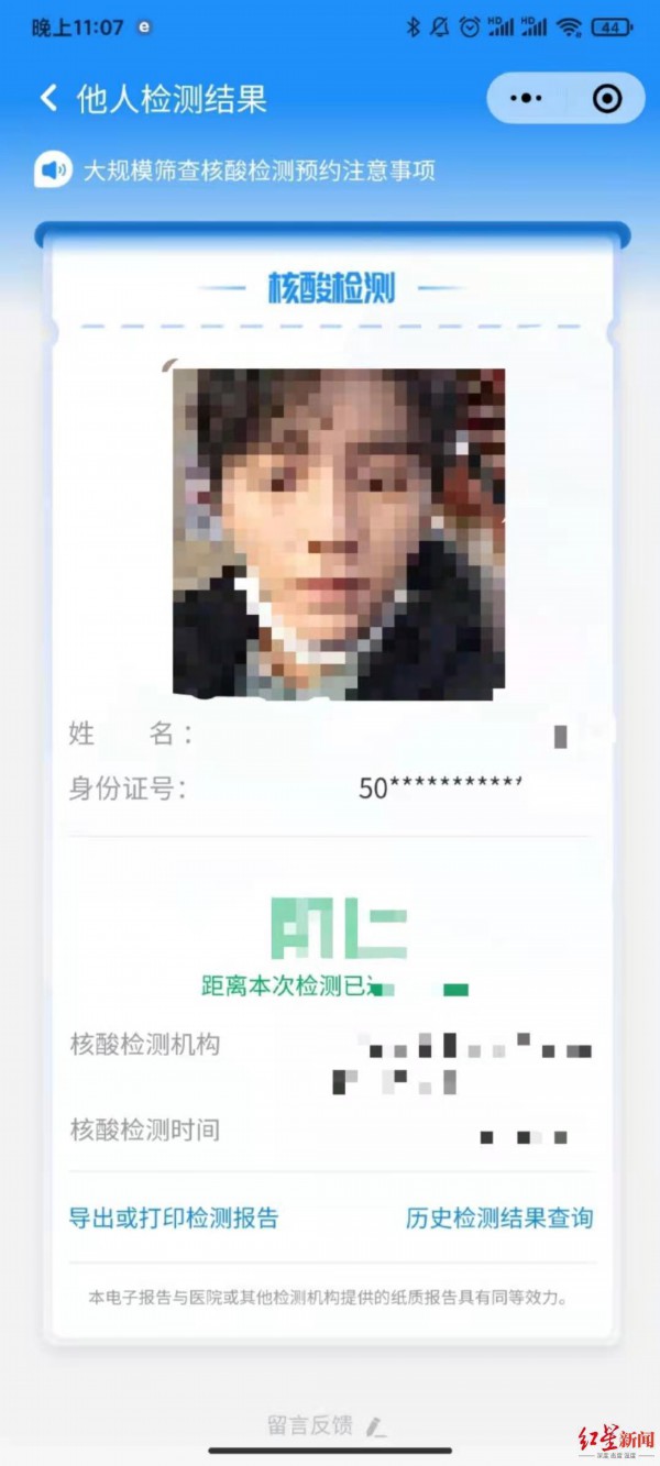 红星新闻记者尝试发现,在上述页面中输入明星的姓名与身份证号,无需再次人脸识别,即可获得他人在录入个人信息时,进行人脸识别的照片,即代拍们所贩卖的“健康宝照片”。同时,如果被搜索的人做过核酸检查,通过该方式还可得到该人的核酸检查结果与检测机构、检测时间。
