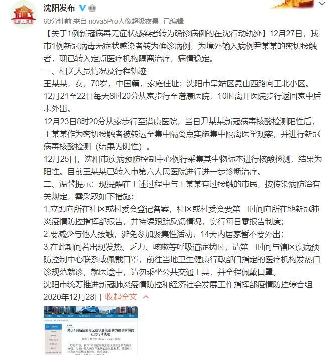 荔枝新闻讯 12月27日,沈阳市1例新冠病毒无症状感染者转为确诊病例,为境外输入病例尹某某的密切接触者,现已转入定点医疗机构隔离治疗,病情稳定。