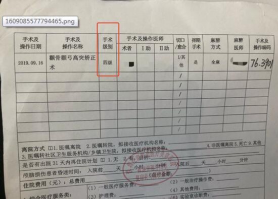 刘丽向记者提供的病历档案显示,江南阳光医院为其实施的颧骨额弓高突矫正术(即颧骨额弓降低术)的级别为四级