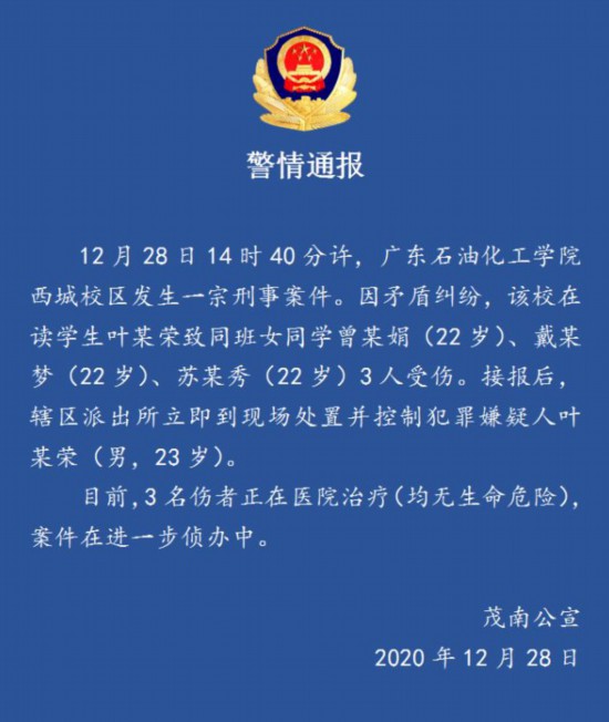荔枝新闻讯 28日14时40分许,广东石油化工学院西城校区发生一宗刑事案件。因矛盾纠纷,该校在读学生叶某荣(男,23岁)致同班3名女同学受伤。警方目前已控制犯罪嫌疑人。目前,3名伤者正在医院治疗(无生命危险),案件在进一步侦办中。详情》