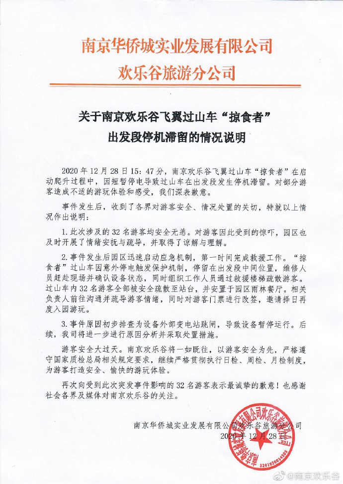 28日晚间,南京华侨城实业有限公司旅游分公司对外发布《关于南京欢乐谷飞翼过山车“掠食者”出发段停机滞留的情况说明》,指出故障为“设备外部变电站跳闸,导致设备暂停运行。”