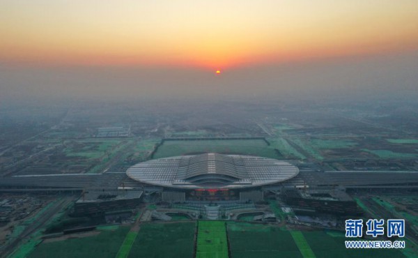12月27日,开通当日晨光下的京雄城际铁路雄安站(无人机照片)。新华社记者 牟宇 摄