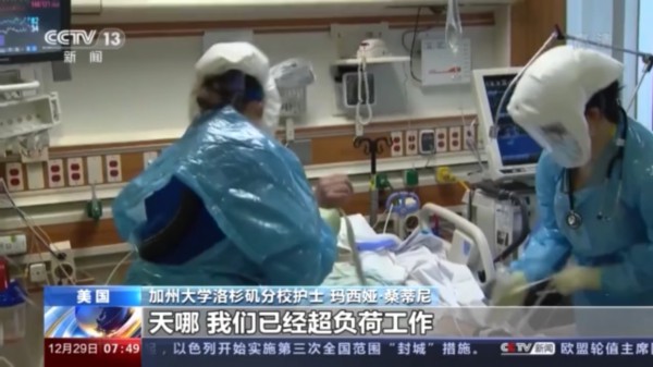 美国加州大学洛杉矶分校护士 玛西娅·桑蒂尼:天哪,我们已经超负荷工作,我们医院不断涌入来自各个地方的新冠肺炎患者。我们搞砸了,公众根本不听,我们继续无视疾控中心的建议,还在搞聚集活动,我们的政府搞砸了。