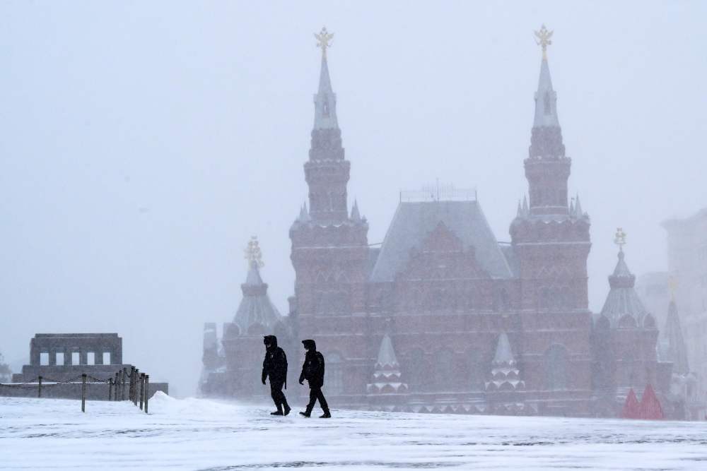 12月25日,警察在雪中的俄罗斯莫斯科红场执勤。
