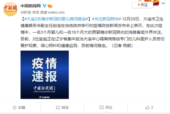 12月29日,大连市卫生健康委员会副主任赵连在当地政府举行的疫情防控新闻发布会上表示,在此次疫情中,一名3个月婴儿和一名18个月大的男婴确诊新冠肺炎的消息备受外界关注。目前,2位宝宝正在辽宁省集中救治大连中心隔离病房由专门的儿科医护人员密切看护观察,细心照料和健康监测,目前情况稳定。