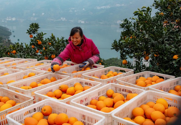 △2020年12月27日,湖北省秭归县水田坝乡下坝村村民在整理即将出售的脐橙。