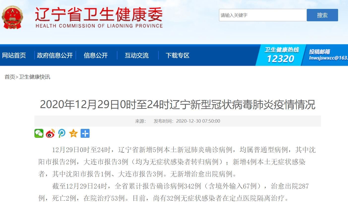 截至12月29日24时,全省累计报告确诊病例342例(含境外输入67例),治愈出院287例,死亡2例,在院治疗53例。目前,尚有32例无症状感染者在定点医院隔离治疗。