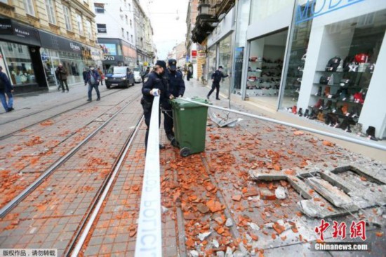 当地时间12月29日,克罗地亚萨格勒布,工作人员将街道上掉落的建筑物碎片围起来。