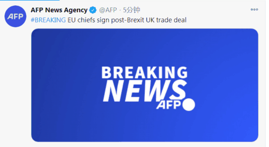 据法新社刚刚消息,欧盟领导人签署英国“脱欧”后的贸易协议。