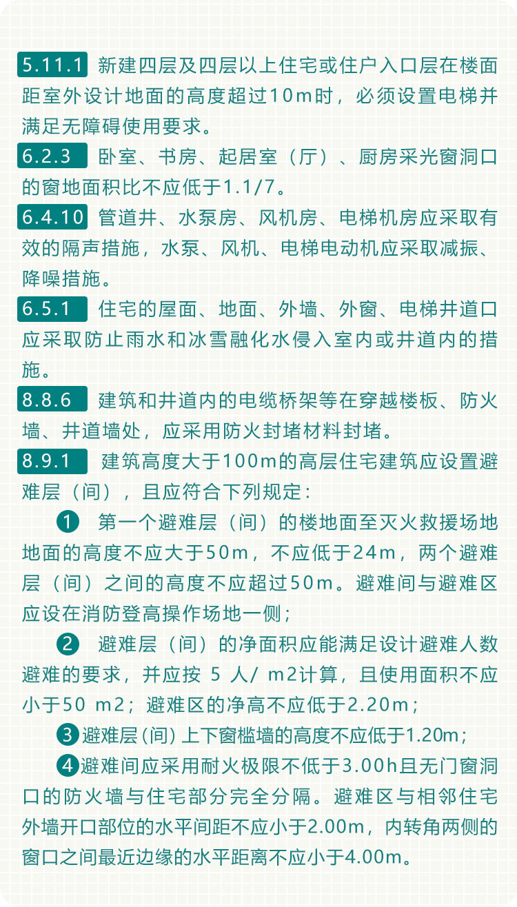 新标准共有强制性条文55条,必须严格执行。其中,有49条是引用现行国家标准或行业标准中的强制性条文,新增的6条,是在借鉴国家标准有关条款的基础上结合江苏实际制定,涉及电梯设置、采光、隔声、防火、消防救援等要求:
