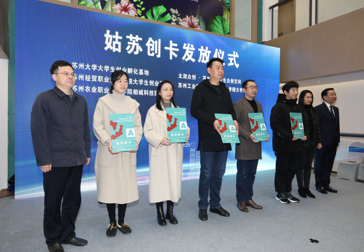 12月29日,苏州市大学生公共创业实训基地还向全市18所高校创业园代表发放了“姑苏创卡”,园内大学生凭卡可免费在苏州大学生公共创业实训基地使用工位、场地和各项设施,同时,人社部门将直送各项创业服务和政策,帮助高校大学生实现在苏创业“零成本”,让更多大学生想创业、敢创业、能创业、创成业。“姑苏区SYB创业培训,让我第一次对财务、运营有了系统的认识,在基地,享受到许多市、区创业扶持政策和暖心服务。”现场,苏州薄荷信息科技有限公司总经理钱伟忠和大家分享了自己的创业经历。