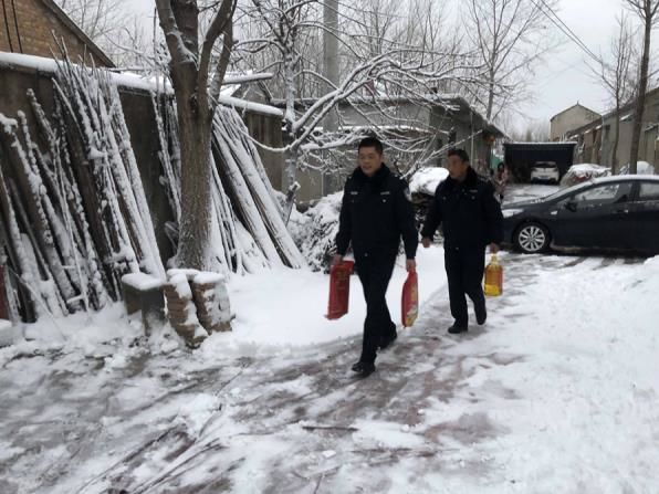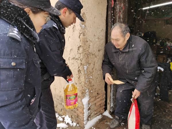 该分局龙河派出所民警、辅警冒着大雪为老人送去生活用品,详细询问生活情况、身体状况,嘱咐老人在雪天注意保暖,轻易不要外出。